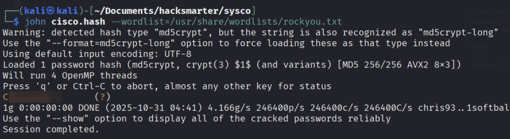 └─$ john cisco.hash --wordlist=/usr/share/wordlists/rockyou.txt