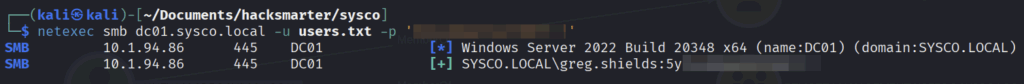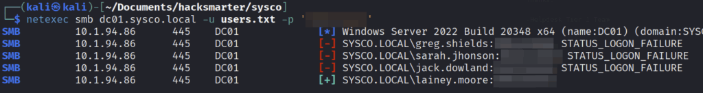 └─$ netexec smb dc01.sysco.local -u users.txt -p 'PASSWORD'