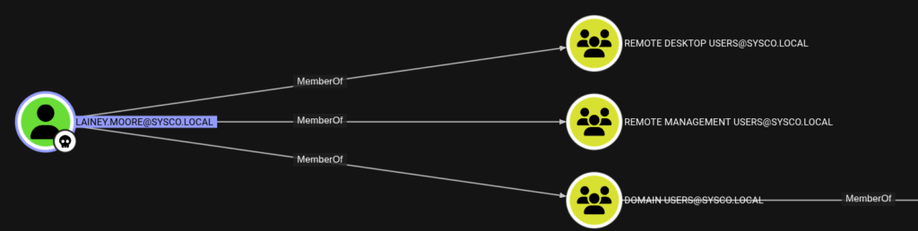 If we have a look at this user in Bloodhound we see that this user is member of the groups Remote Desktop Users and Remote Management Users