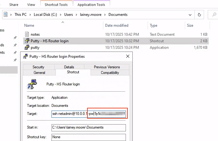 There is a Shortcut called „Putty – HS Router login“. If we open the properties of this shortcut we can see a ssh connection string in the target column.