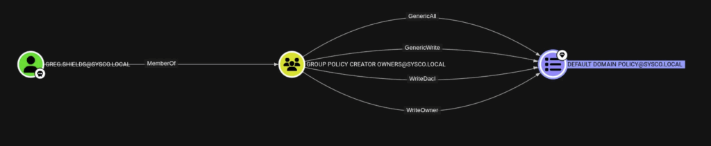 We see that greg.shields is a member of Group Policy Creator Owners, this group has GenericAll over the Default Domain Policy which means we are able to modify this GPO.