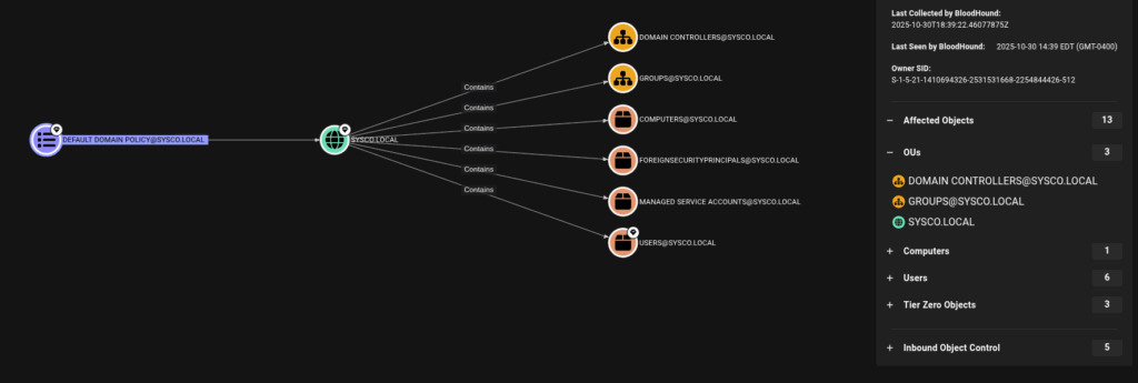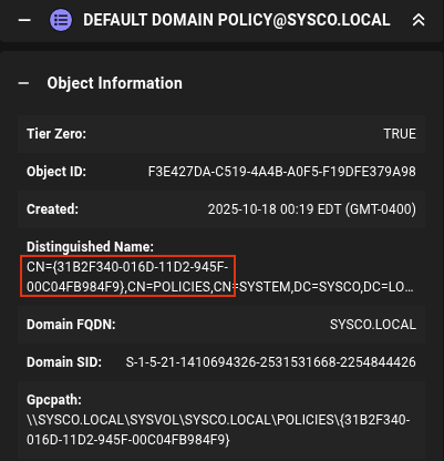 Note that we have to provide here the gpo-id. You can find this in Bloodhound at the properties of the Default Domain Policy GPO