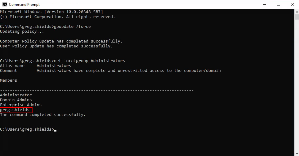 gpupdate /forceIf everything worked with pyGPOAbuse we see that our user greg.shields is now a member of the Administrators group